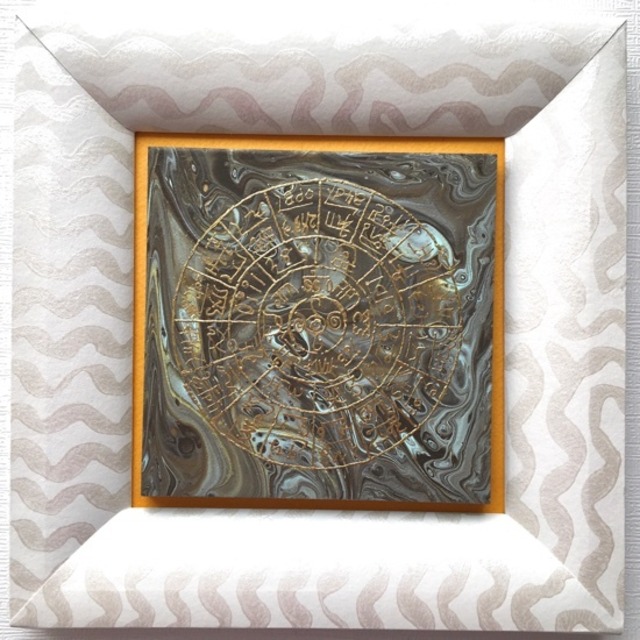 フルイドアートに龍体文字フトマニ図を描いています。流れるように広がる絵の具の模様が、神秘的な雰囲気を醸し出しています。 古代文字である龍体文字で描く『フトマニ図』は神々が鎮座する様子を表していると言われています。そのため、フトマニ図には強力なパワーが宿っており、これ自体が護符として使われてきたそうです。 フルイドアート作品本体はMDF材にアクリル絵具で描いています。 晶さんによる『フランス額装』が施されています。額装済みなのですぐに飾れます。 額装は紙製です。壊れやすいので取り扱いにご注意願います。 サイズ 170㎜×170㎜×15㎜ 自然光で撮影しておりますが環境により色味が微妙に異なる可能性がありますのでご了承ください。