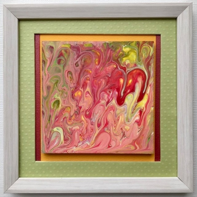 アートのような美しさが詰まった、フルイドアートのミニキャンバス。手作業で丁寧に制作された一点ものの作品で、その流れるような色合いは心を癒します。 フルイドアート作品本体は小さなキャンバスにアクリル絵具で描いています。 晶さんによる額装が施されています。 額装は紙製です。壊れやすいので取り扱いに注意願います。 サイズ 150㎜×150㎜×20㎜ 自然光で撮影しておりますが環境により色味が微妙に異なる可能性がありますのでご了承ください。