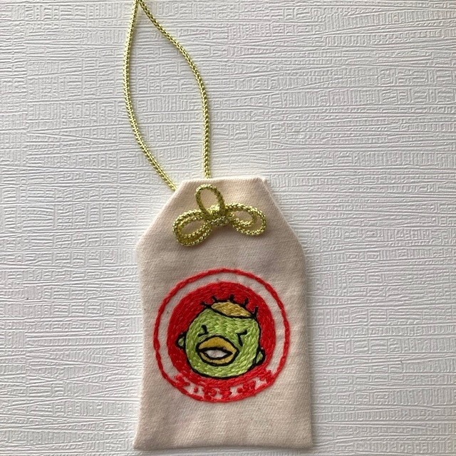『河童ちゃんのなんか陽気になるお守り』を作りました。手刺繍で仕上げています。 中には招福河童ちゃんのイラストお札が入っています。 手に取ると、なんか陽気になるはず(笑)です。 サイズはおおよそ横55mm、高さ90mmです。 竜胆の手作りですので若干の歪みなどがあります。あらかじめご理解の上ご購入ください。