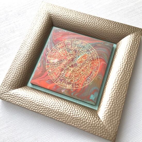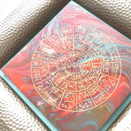 フルイドアートに龍体文字フトマニ図を描いています。流れるように広がる絵の具の模様が、神秘的な雰囲気を醸し出しています。