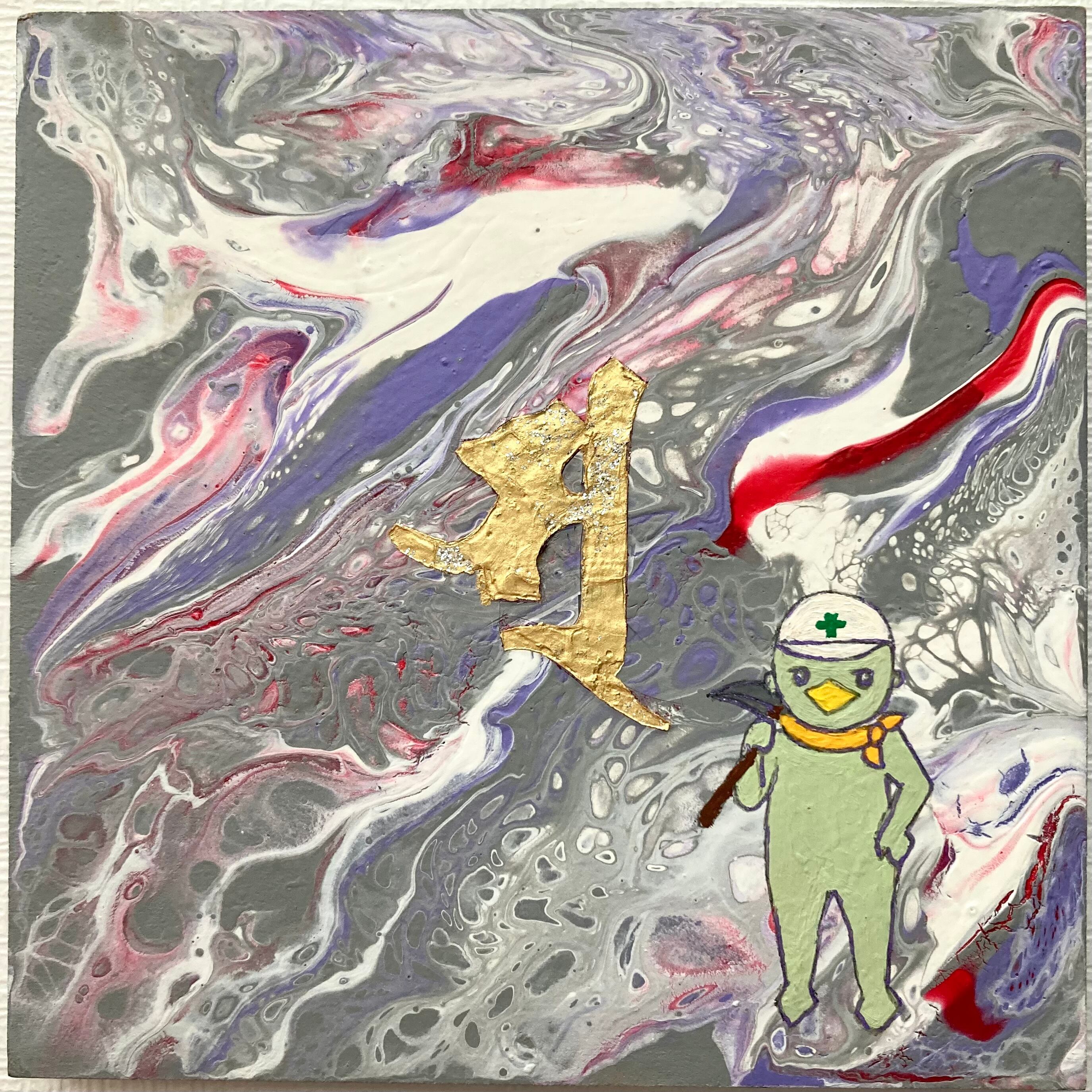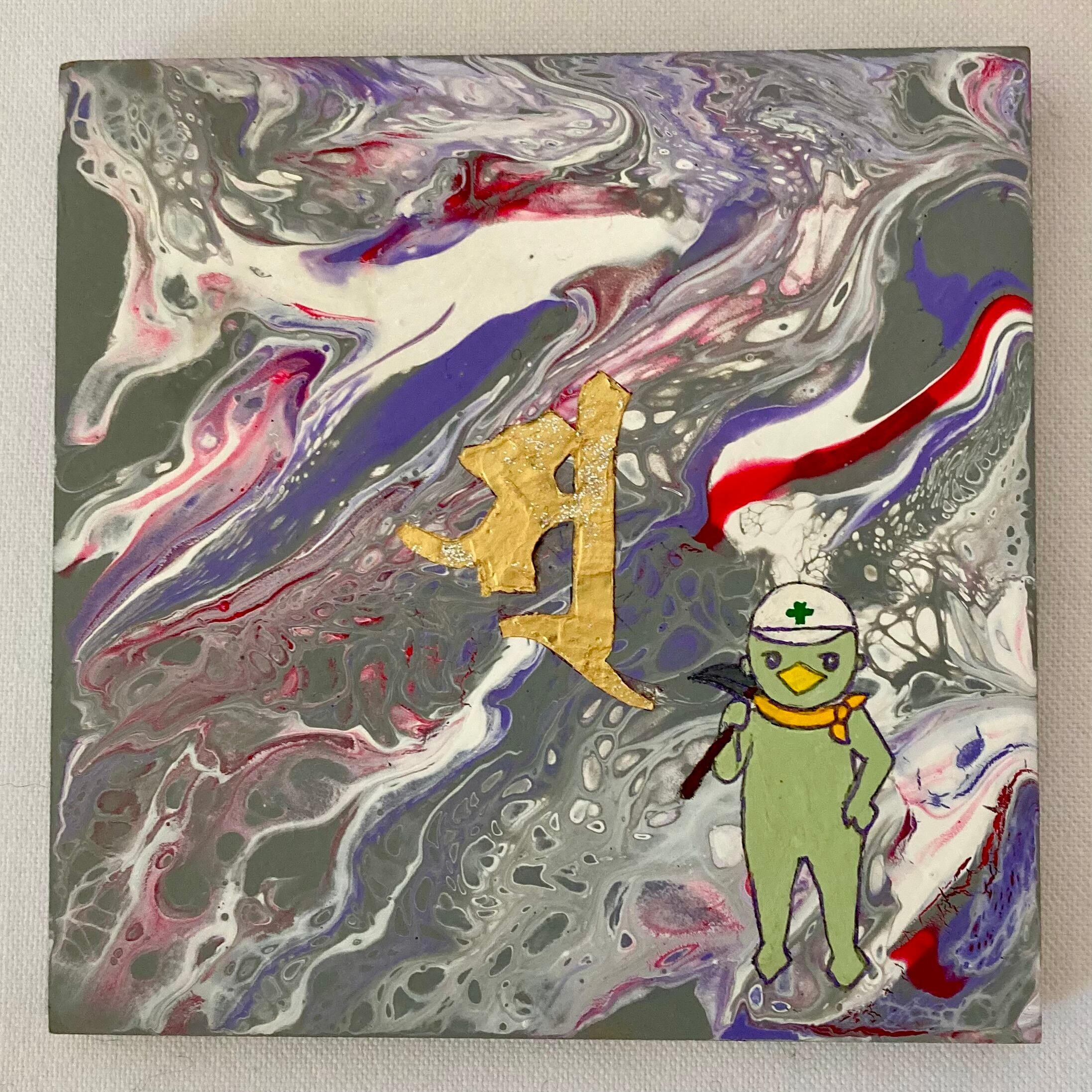 MDF板に描いたフルイドアート作品に河童ちゃんイラストを描いています。河童ちゃんのユニークで愛らしい表情や、フルイドアートの流れるような動きが魅力的。お部屋に飾るだけで、ほっこりとした癒しの空間を演出してくれます。