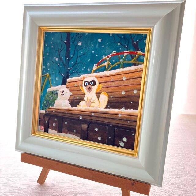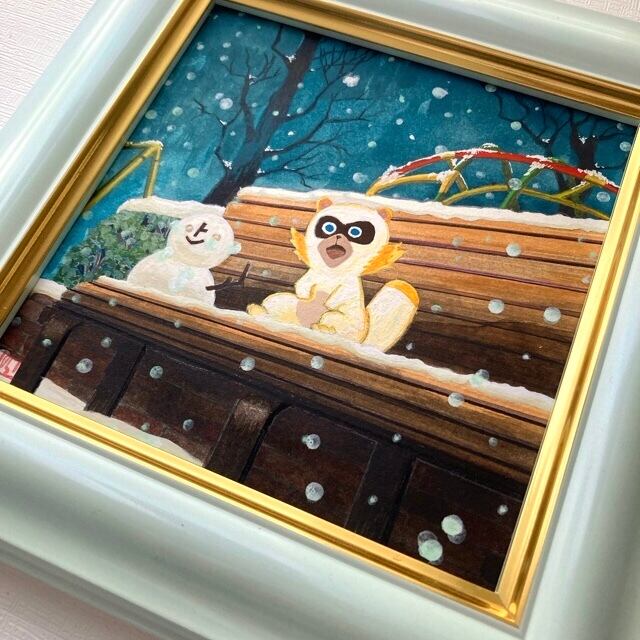 「あちゃぽんと雪景色」 水彩画 額付き