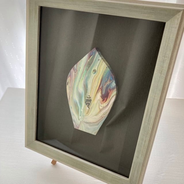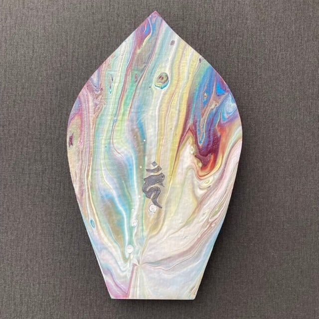 散華の形の木材にフルイドアートを描きました。そこに不動明王様の梵字を入れています。美しく流れるようなフルイドアートに不動明王様の炎のイメージを想起しました。