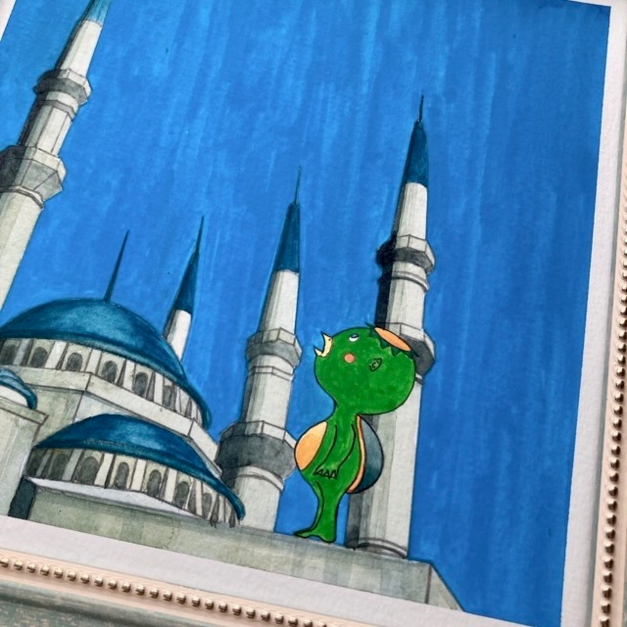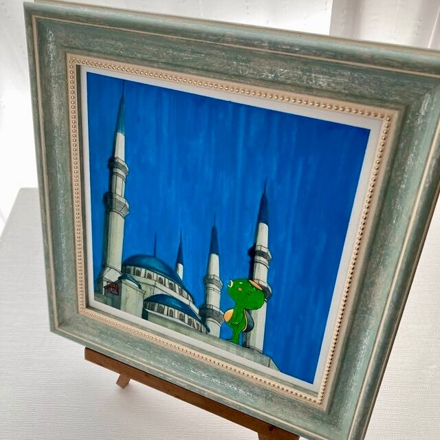 「河童ちゃん街道をゆく トルコ編」は、水彩で描かれた可愛らしいイラストのアート作品です。真っ青な空の下、トルコでブルーモスクを見上げる河童ちゃんを描いてみました。お部屋のインテリアとして飾れば、日常にほんのり幸せな気持ちを運んでくれること間違いありません。きっと河童ちゃんの愛らしさや美しいブルーモスクに想いを馳せることで癒しとそして何となく陽気な気分になっていただけるのではないでしょうか。