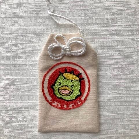 『河童ちゃんのなんか陽気になるお守り』を作りました。手刺繍で仕上げています。