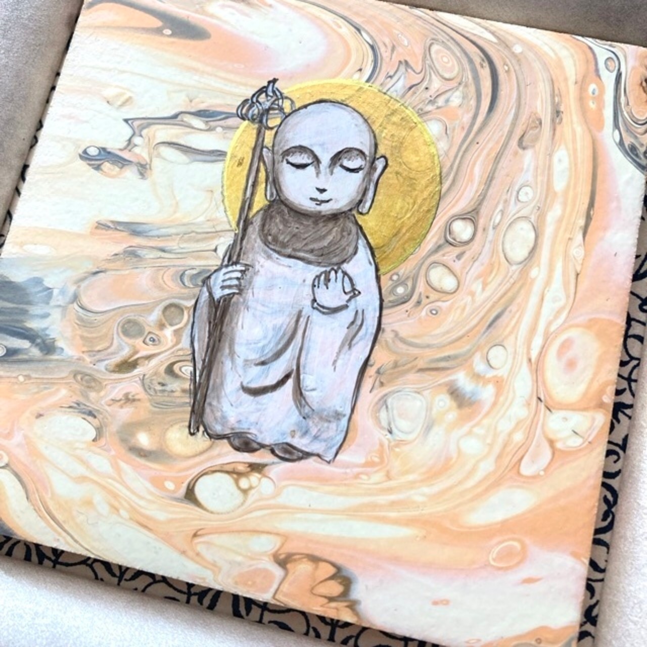 お地蔵さまの愛らしいイラストをフルイドアートに仕上げた、額装タイプの作品です。作者、竜胆の思い入れが強い作品のひとつです。
