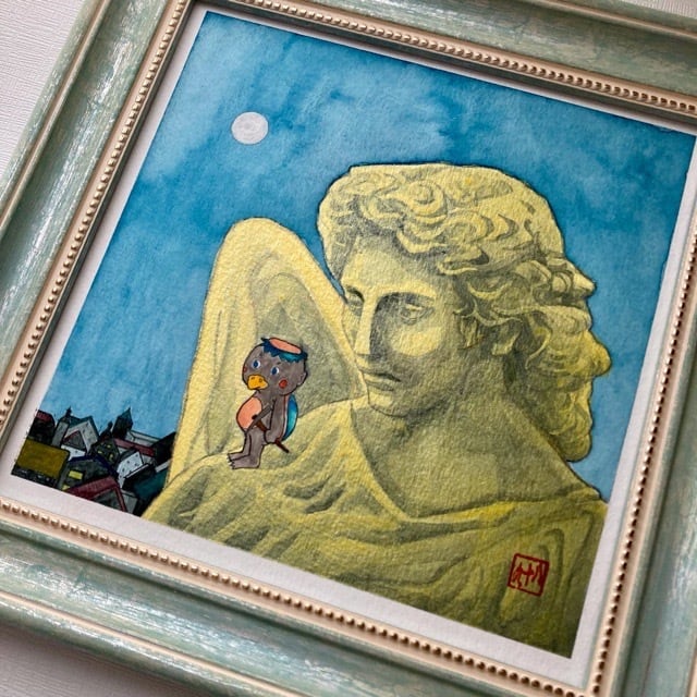 「河童ちゃん街道をゆく ドイツ編」は、水彩で描かれた可愛らしいイラストのアート作品です。ドイツの天使像の上で街を見下ろす河童ちゃんを描いてみました。お部屋のインテリアとして飾れば、日常にほんのり幸せな気持ちを運んでくれること間違いありません。河童ちゃんの愛らしさやドイツの街に想いを馳せることで癒しを感じ、そして何となく陽気な気分になっていただけたら嬉しいです。