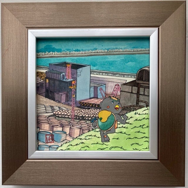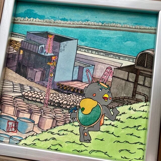 「河童ちゃん街道をゆく フクシマ編」は、水彩で描かれた可愛らしいイラストのアート作品です。福島の地で忙しく働く灰色河童ちゃんを描きました。お部屋に飾れば、日常にほんのり幸せな気持ちを運んでくれること間違いありません。東北やその地下水脈で一生懸命に働く河童ちゃんに想いを馳せていただけたら嬉しいです。